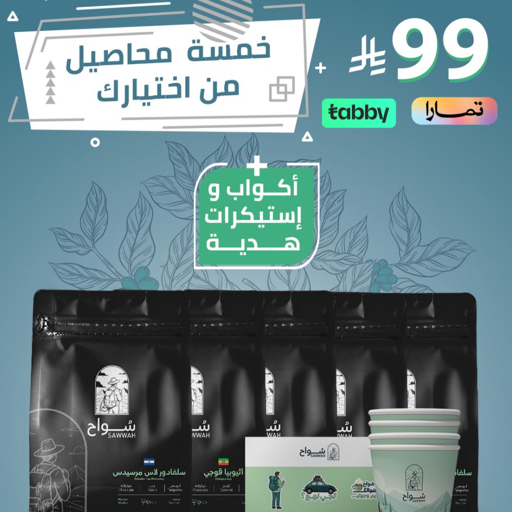 أفضل عروض قهوة مختصة عرض الرحلة إذا كنت من عشاق القهوة المختصة، فلا تفوت فرصة نقدمها لك في سواح نقدم لك عرض الرحلة الذي يجمع بين 5 محاصيل قهوة مميزة من كولومبيا، سلفادور، إثيوبيا والبرازيل.